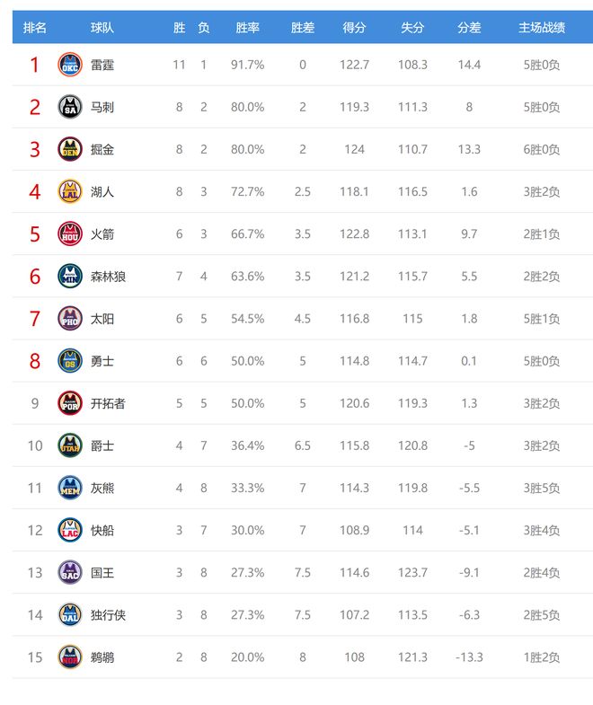 北京时间2025年11月12日,今日NBA有6场比赛,勇士、掘金、雷霆、灰熊、国王、爵士参与其中,赛后西部排名发生了变化,7队排名发生了互换。